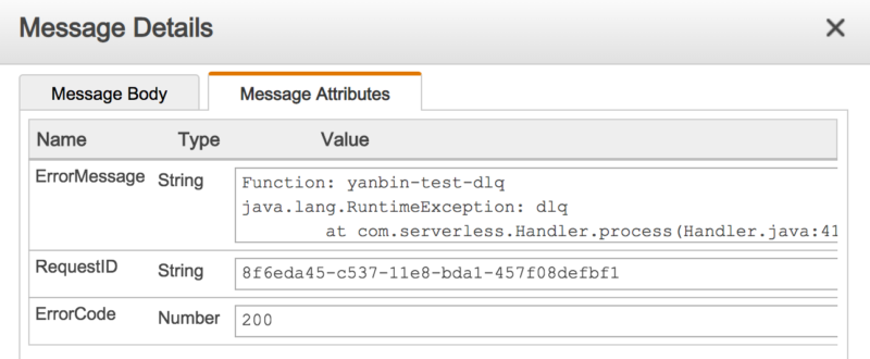 从这里发现从 DLQ 中的消息一个能用于追踪原 Lambda 的信息是 RequestId,还有就是 ErrorMessage,不过它只是取到原 Lambda 的异常的 getMessage() 消息,过于简单。但我们可以用 ErrorMessage 携带更有用的错误信息,看接下来