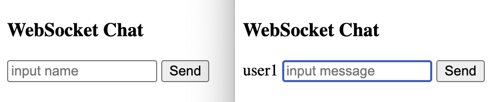 在第一个浏览器中输入 user1, 然后看到 user1 [input message] (Send) 的式样。在另两个窗口中分别输入 user2 或 user3, 以此来标识各自的用户名分别是 user1, user2 和 user3.