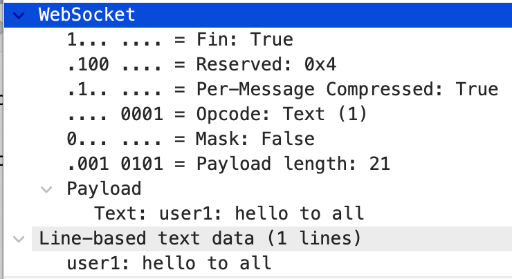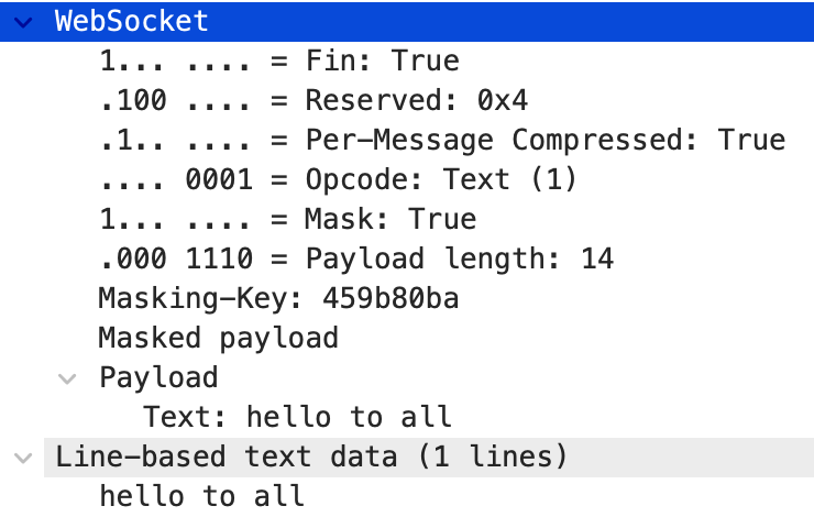 注意,WebSocket 不像 HTTP, 它是一个二进制的协议看下一个客户端向服务端发送