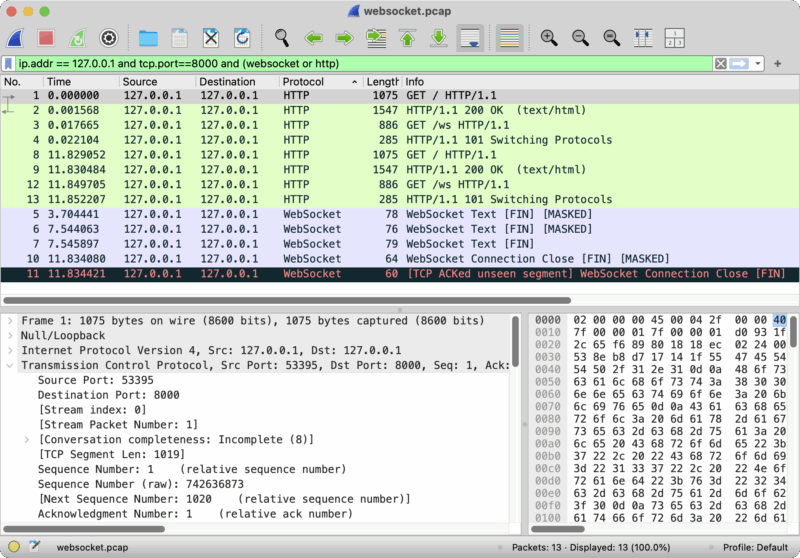 这是上图对应的报文数据 websocket.pcap,可以用 Wireshark 打开。