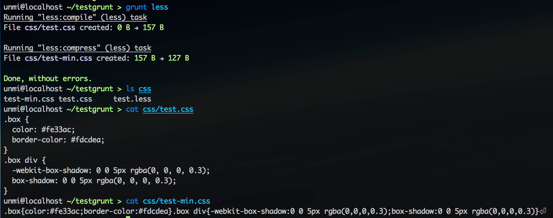 grunt less 就能生成 test.css 和 test-min.css 文件,看命令: