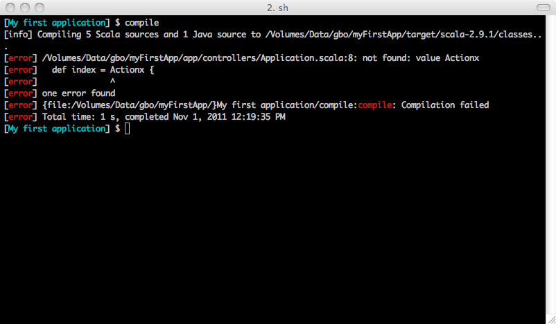 compile 命令: Unmi 注: 这就是 sbt 给我们带来的特性。1[My first application] $ compile