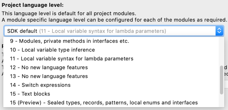 欲大致但全面的了解每一个版本 Java 的新特性最好是读它的每一个 JDK Release notes。我们也可以去瞧瞧 IntelliJ IDEA 在 Project Settings 中选择 Project language level 时对每一个 JDK 的一句话评价