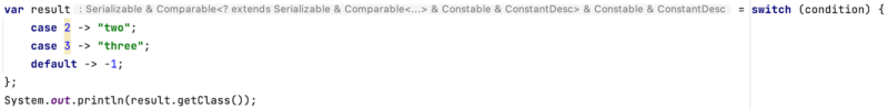 当然打印出来的 result.getClass() 是对的 class java.lang.Integer。switch 表达式的值类型推断相当是为每个分支类型找到一个最小公倍数,这样的话,其后对 result 重新赋值时可以赋以先前 swtich 表达式中每一个 case 的类型。所以用 var 来推断 switch 表达式的值类型时不是简单的标识为
