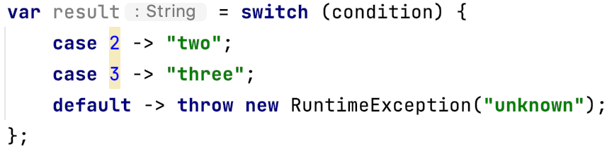 switch 表达式的 case 中可以抛出异常,抛异常的分支不会影响到对整个 switch 表达式值类型的推断