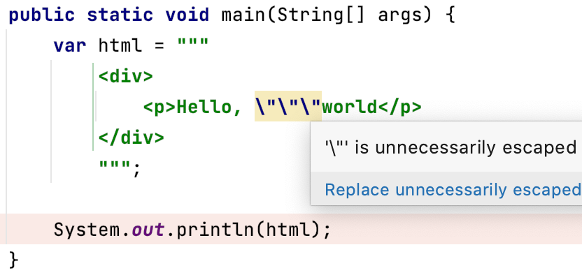 Java 15 的 Text Blocks 好像也有借鉴这一做法。关于此先暂停一阶段,另一个 Text Blocks 问题,关于字符串的转义
