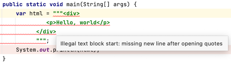 不管编码中退格到了多少层次, Text Blocks 要出现的时候,每行的起始位置都要回归到最左端算起,这才叫做不忘初心。