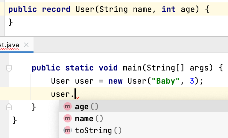 把 class 换成了 record 关键字,仍然可以认为它是一个类的定义,所以后面的大括号 {} 不能少,我们还能在其实加上其他的方法,或覆盖默认的实现。使用当中看下
