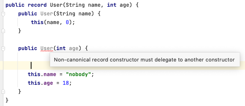 有了 "Non-canonical record constructor must delegate to another constructor" 这个约束的话也就基本无法在自己的构造函数中用 this.name = "nobody" 这样的赋值,因为一旦调用别的构造函数,所有的 private final 字段就不能再次赋值了。除非把 record 的自动生成的构造函数也覆盖了 1public record User(String name, int age) {