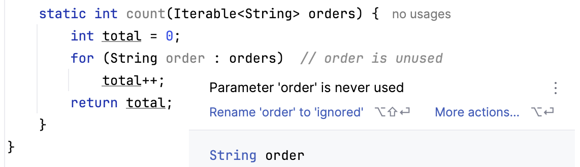 IntelliJ IDEA 会提示命名为 ignored 来避免该提示