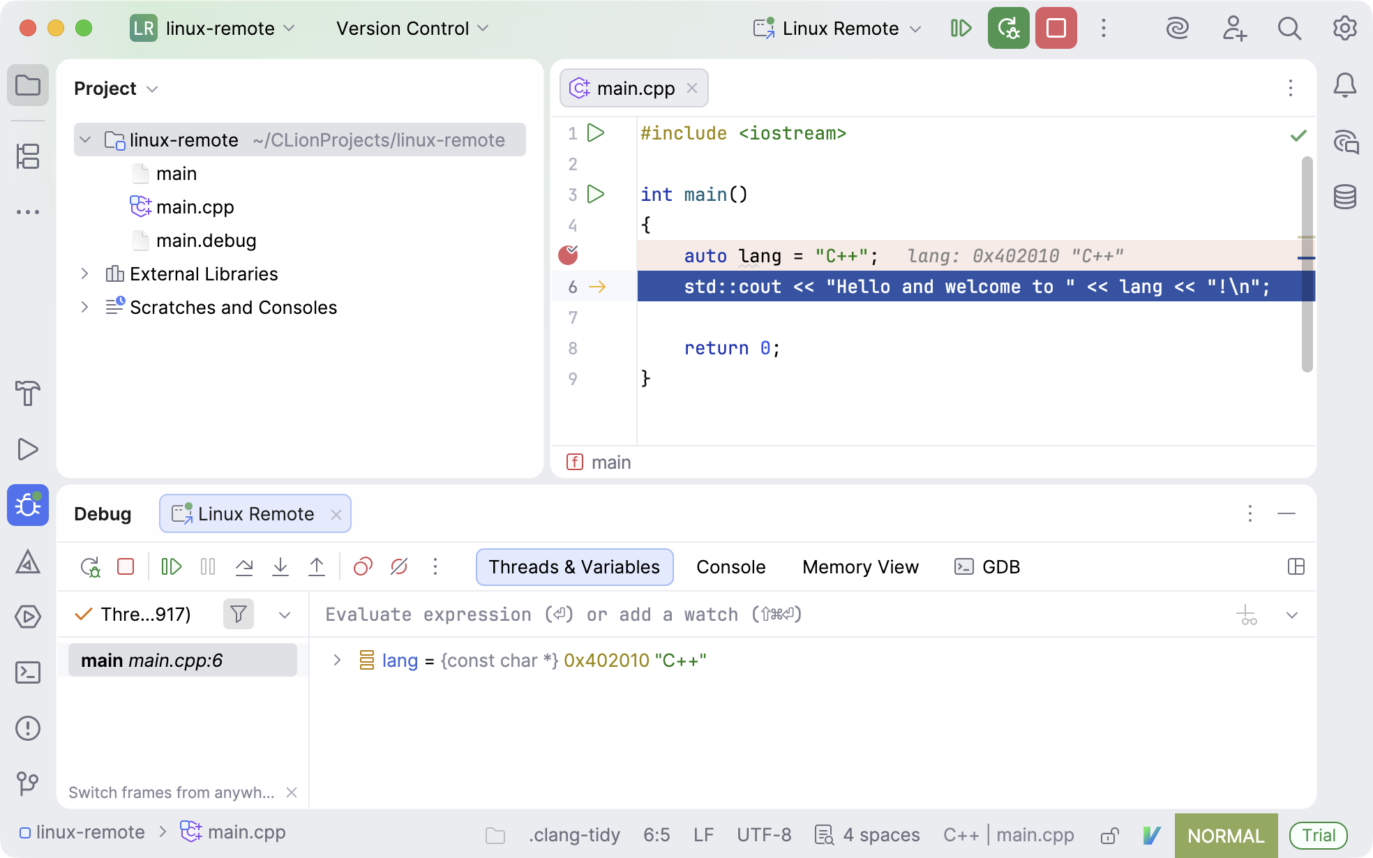 在源代码中打上断点,然后点击 Debug 'Linux Remote', 成功连接上远程的 gdbserver 后,在远程的控制台可以看到输出