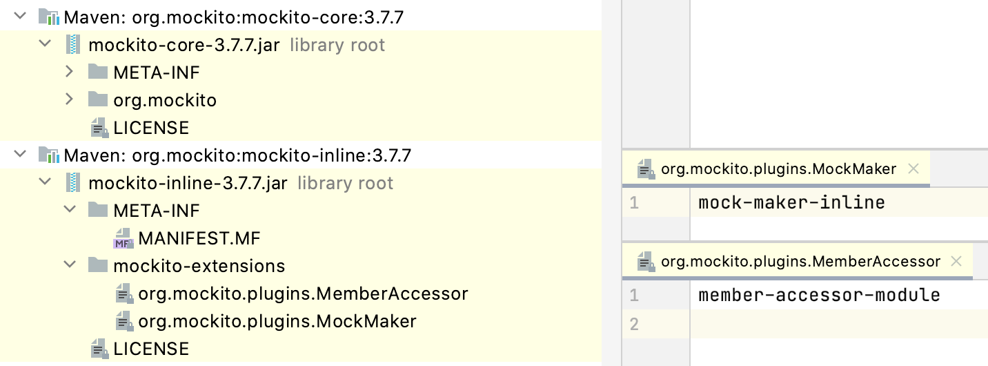 实质上 mockito-inline 就是给 mockito-core 添加了两个插件配置,分别是 org.mockito.plugins.MockMaker