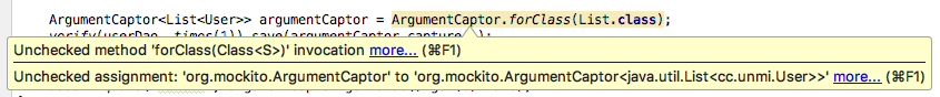 ArgumentCaptor.forClass(List.class) 指定更内层的类型 User, 它的方法原型参数是 forClass(Class clazz), 所以代码行ArgumentCaptor<List<User>> argumentCaptor = ArgumentCaptor.forClass(List.class);有一个不安全类型赋值
