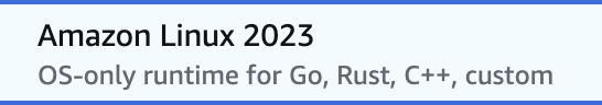 OS 方面当然是要选择 Amazon Linux 2023 优于 Amazon Linux 2。选择 Amazon Linux 2023 或 Amazon Linux 2 时最后还有一个 custom,也就是说可以自义的定义自己的 Lambda 运行时,可选择任何语言,只要符合 AWS Lambda 调用的接口规范 Using the Lambda runtime API for custom runtimes 即可。不过完全定义吗,还挺罗嗦的,用官方直接支持的语言就容易多了。 Read More