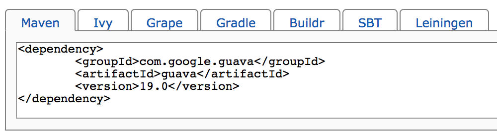 在我们搜索 Java 第三方依赖时常常进到类似这样的页面 http://mvnrepository.com/artifact/com.google.guava/guava/19.0