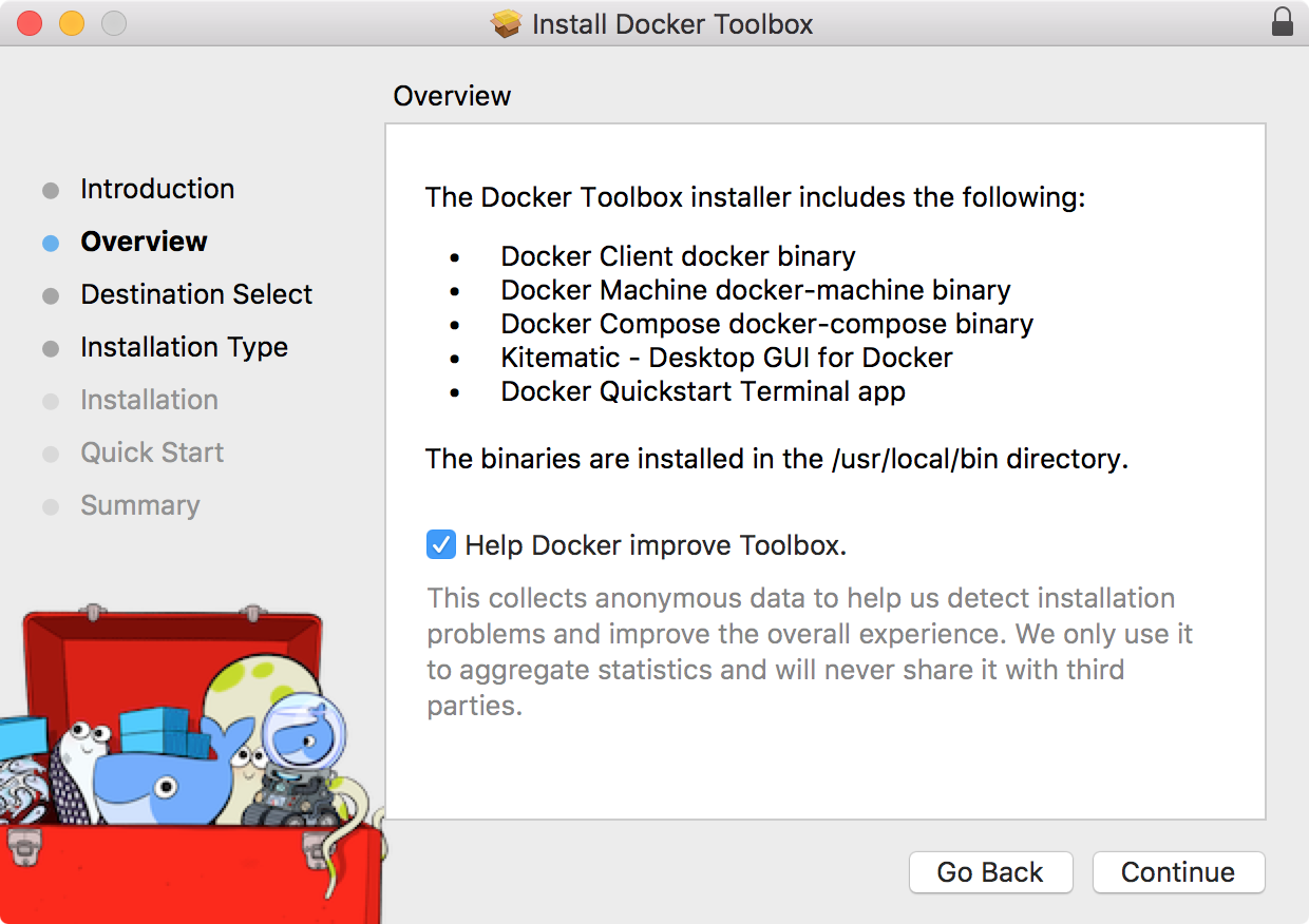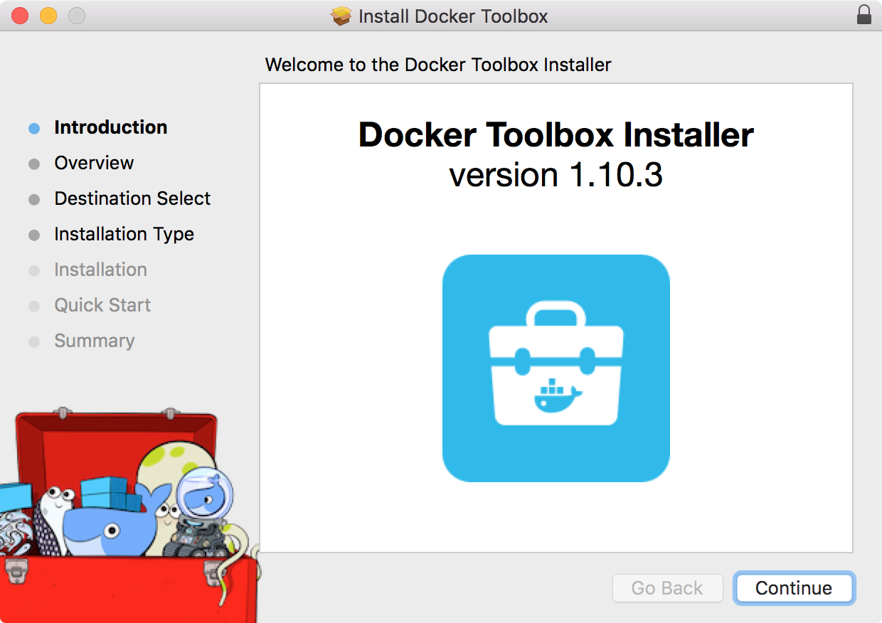 如果你热爱图形界面来安装应用的话, 可以到页面 https://www.docker.com/products/docker-toolbox 中下载 Mac 的版本的 DockerToolbox-1.10.3.pkg, 当前版本是 1.10.3