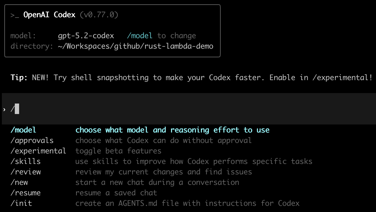 - /skills 使用 skill 来指导 Codex 如何执行特定的任务
