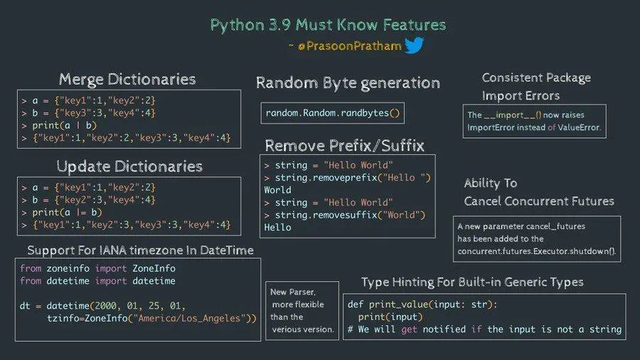字典的更新/合并, 字符串新增删除前/后缀的方法,datetime 支持时区了, Executor.shutdown() 可取消未执行的任务,类型提示可直接用 list[str], dict[str, int] 这样表示泛型