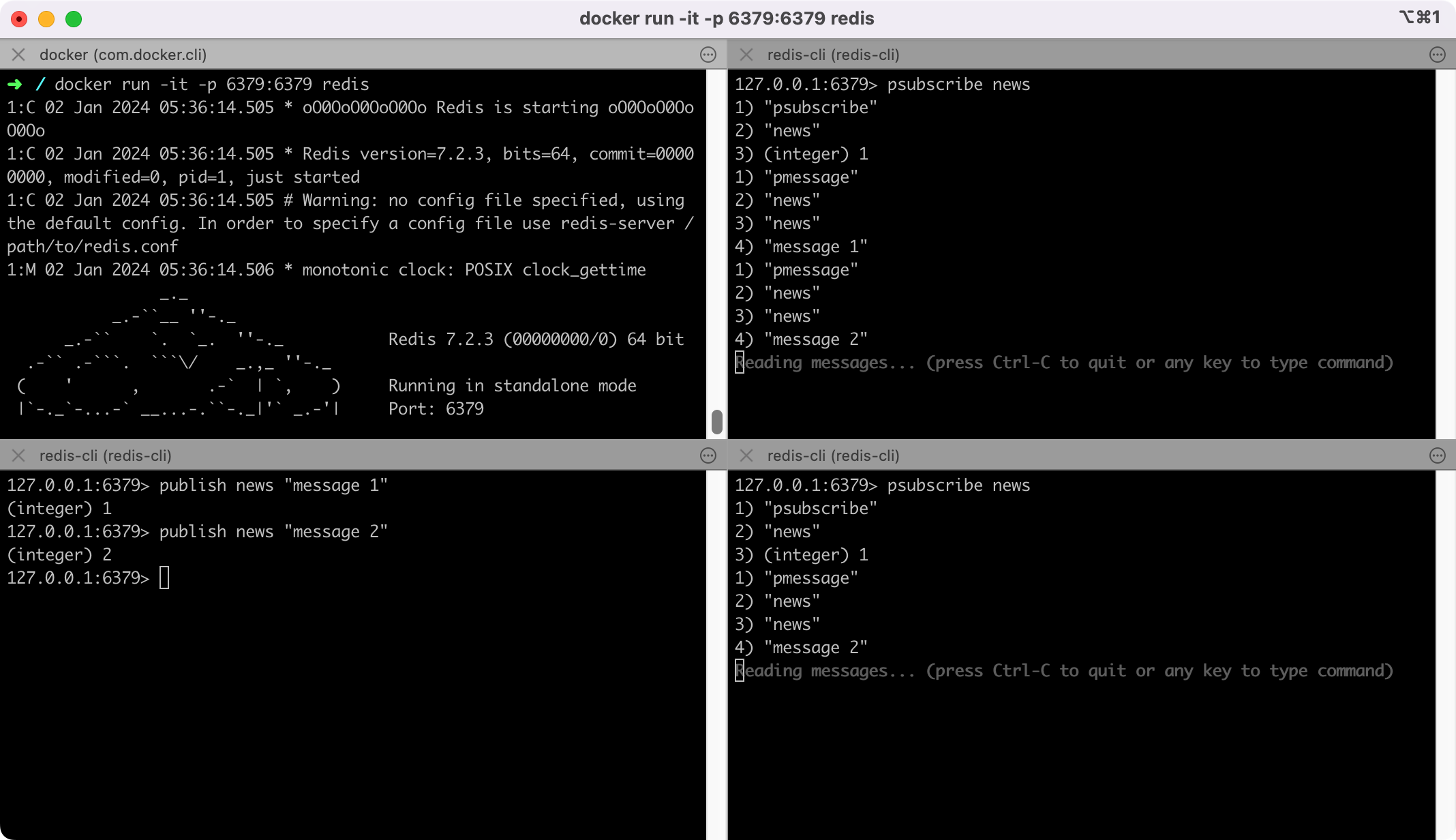 psubscribe news 订阅 news 频道,然后在左下窗口用 publish news "message 1" 往 news 频道中发送一条消息,右上窗口收到该消息。再右下窗口用 psubscribe news 订阅同一频道,它只能收到后续的消息。Pub/Sub 模式消息支持多播,每一个在线的消费者都会收到同样的消息,消息也就会被重复处理。消息不被持久化,也不保存在 Redis 内存中,Redis 宕机就没了,没有在线的订阅者消息也是白发。Pub/Sub 是在 Redis 2.0 就有的功能,看来没怎么用开来是有原因的。