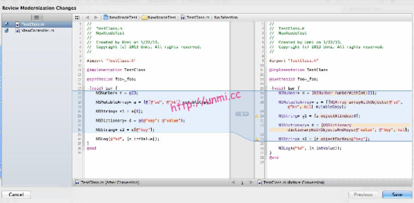 上面那些用法就是 Modern Objective-C,想在老项目中跃跃欲试了吧。Xcode 4.4 为我们提供了迁移工具,Edit -> Refactor -> Convert to Modern Objective-C Syntax,Xcode 帮我们找到项目中所有上面的老语法,代之以新的语法,还有预览: