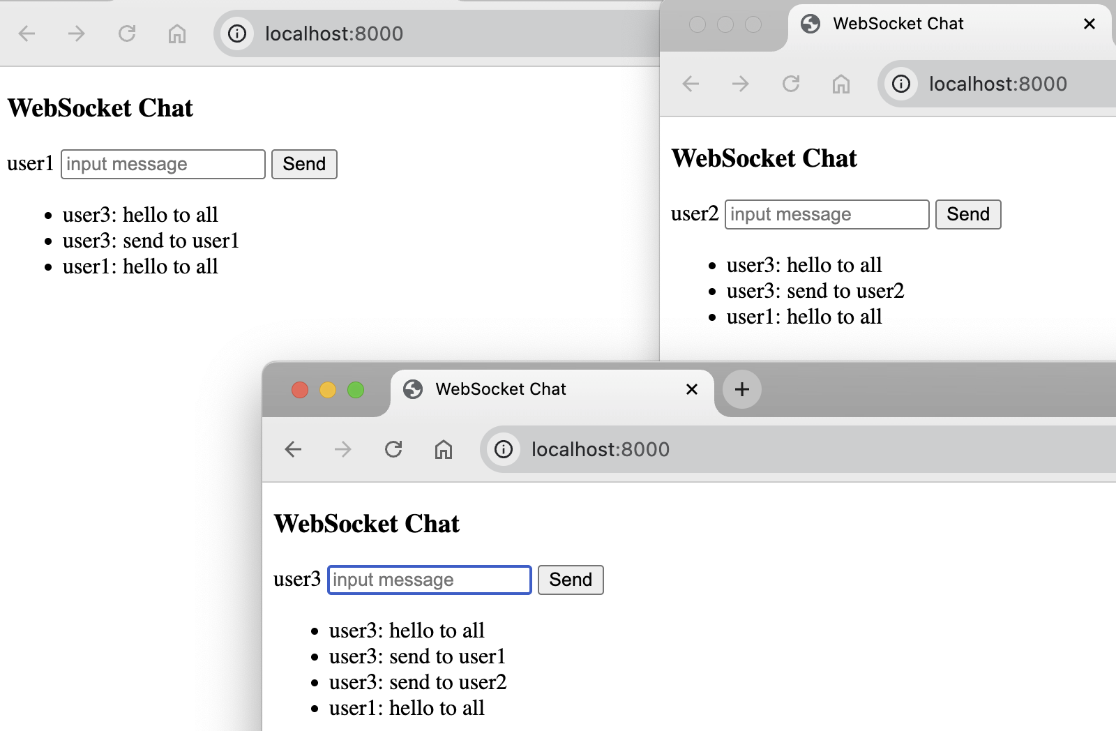 - user3 窗口接着输入 @user2 send to user2, 在 user2 和 user3 窗口同时显示了 user: send to user2