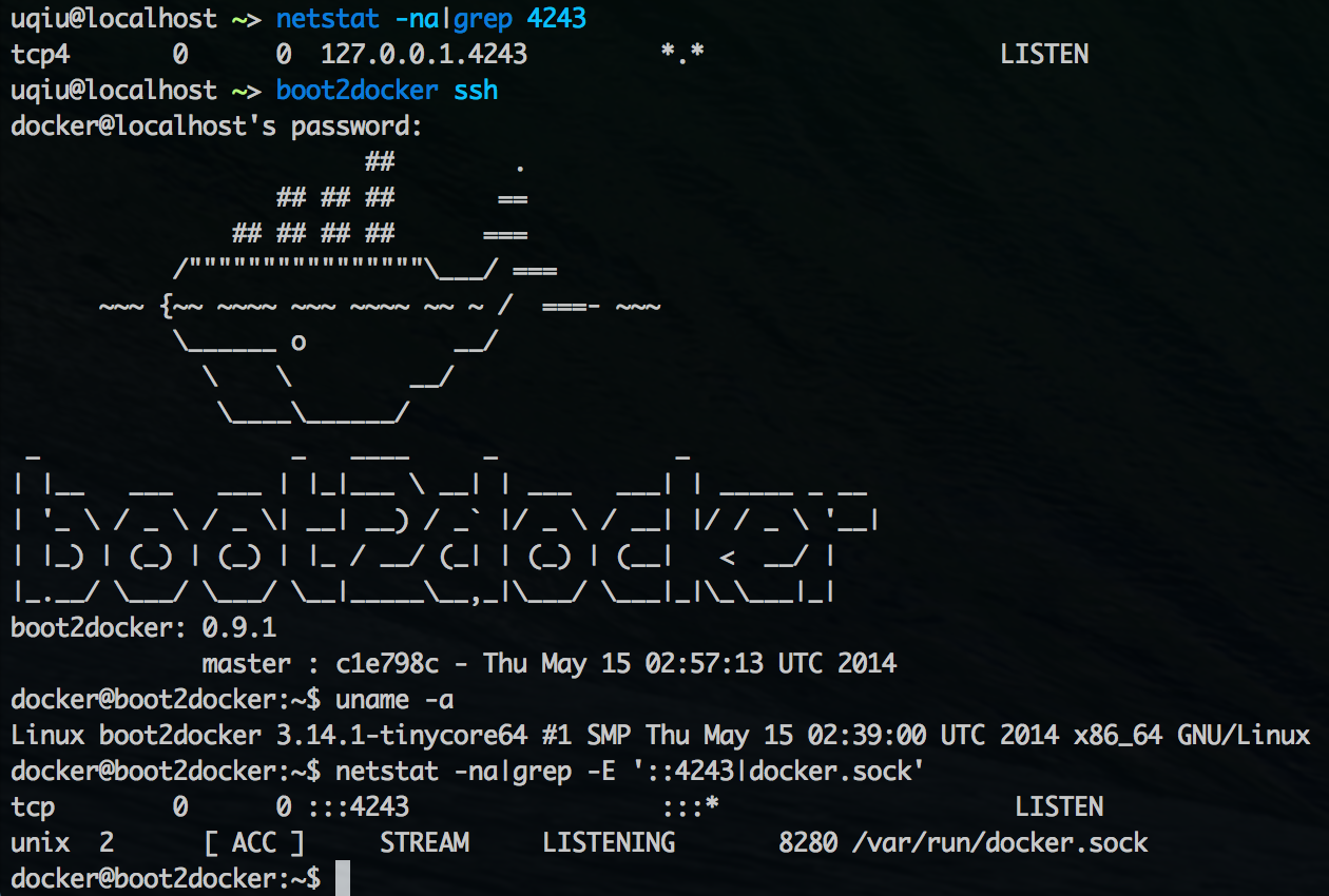 上面看到 Mac 启动了 4243 端口,在 boot2docker 虚拟机中也有 4243 端口,并在 /var/run/docker.sock 上监听。借此回顾下 docker 的通信过程,dock 命令是与 Docker daemon 在  Mac 上开启的  4243 端口通信,该端口映射到 boot2docker 的  4243 端口上,进而通过 /var/run/docker.sock 与其中的容器进行通信。