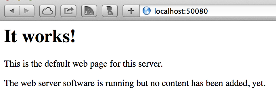 Apache2 正常启动了,在容器内可访问。但现在还无法从 Mac OS X 上对该 apache 服务进行访问,这需要端口映射,有两种方式。不过在端口映射之前还需保存下镜像的修改。