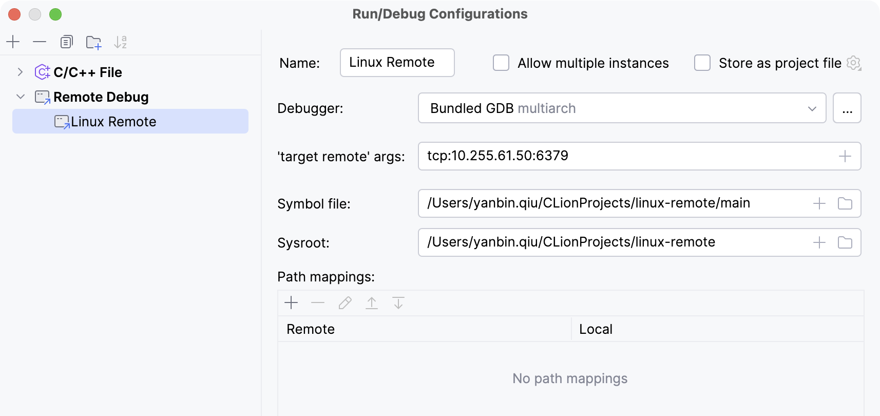 有时需要配置 Path mappings 配置在本地与远程 Linux 机器的路径映射, 如远程的 /work 与本地的 ~/ClionProjects/linux-remote 映射。