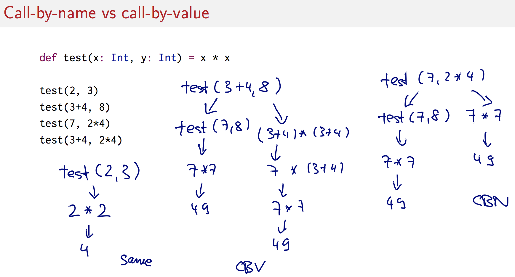 要指定函数参数 y 以 Call-By-Name 传递,要这么定义def test(x: Int, y: => Int) = x * x,这样就避免了 test(3, 2*4) 调用时2*4被求值,这里把 y 转换成了函数参数y: => Int。