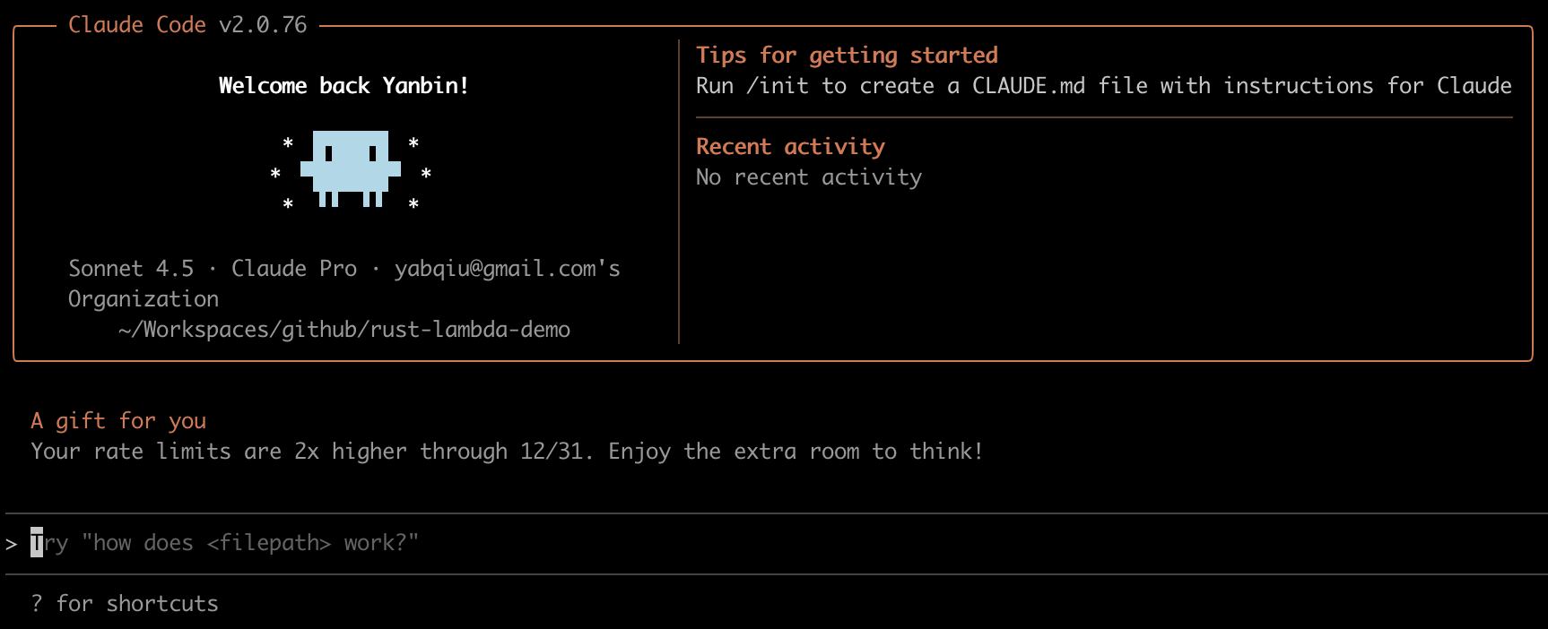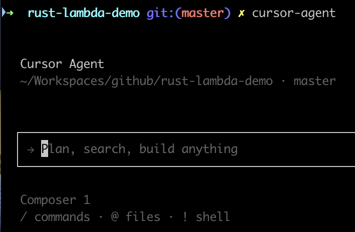 第一次启动 cursor-agent, 还有个控制台下的动画, 配置好 Cursor 用户后就进到与 Codex 一样的输入界面.