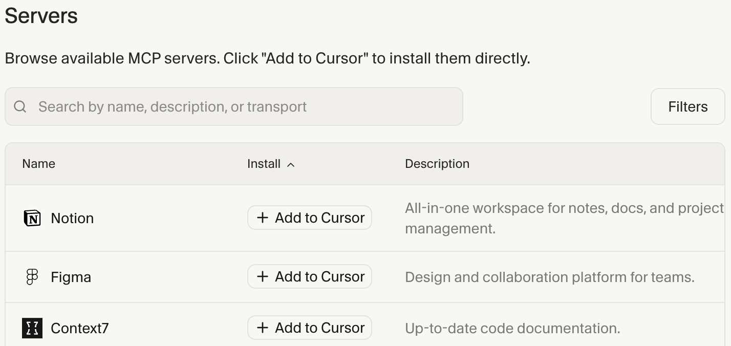 给 Cursor 添加 MCP Server 的方法很简单, 在 Cursor 的官网 Model Context Protocol(MCP) 中目前有 60 多个可添加的 MCP Servers