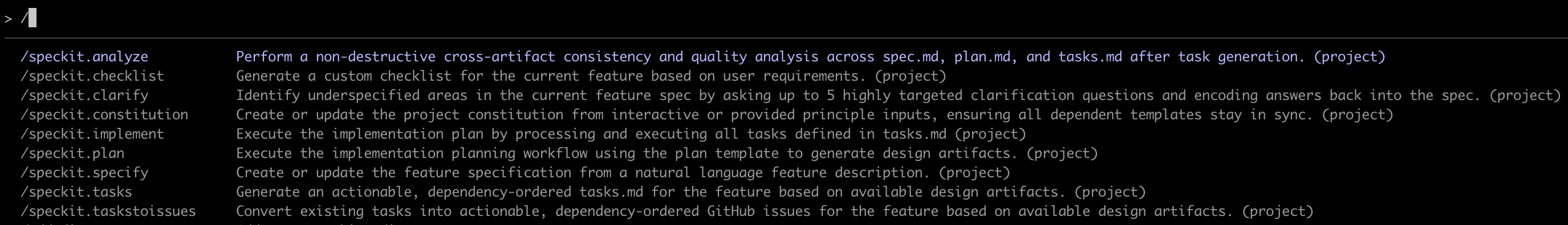 /speckit.specify创建一个 spec, 每次会自动创建一个分支/speckit.plan制定技术实现计划/speckit.tasks创建一系列的分解任务/speckit.implment执行本次 spec 中的任务
