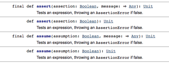 assert() 或 assume() 方法在对中间结果或私有方法的参数进行检验,不成功则抛出 AssertionError 异常,至于是用 assert() 或是 assume() 方法,就各取所好了,Scala 给出的原则如下: