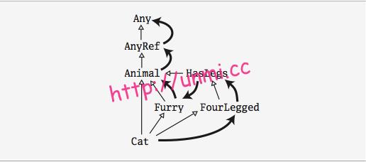 5class Cat extends Animal with Furry with FourLegged下图是 Cat 类的继承层级和线性化次序的展示图