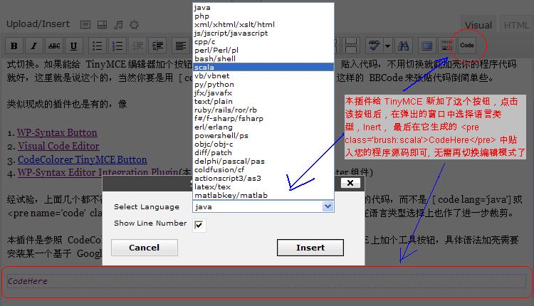 前面已有几篇讲了有关 WordPress 的语法加亮的插件,谁让我的日志中代码特别多呢。在此之前我都是要把编辑器切到 HTML 模式,然后写上 <pre class='brush:java'>CodeHere</pre>,然后回到 Visual 模式,最后贴上代码,麻烦就在于模式切换。如果能给 TinyMCE 编辑器加个按钮,点击后弹出窗口中选择语言类型,贴入代码,不用切换就能加亮你的程序代码就好,这里就是说这个的,当然你要是用 [ code lang='java']CodeHere[/code] 这样的 BBCode 来张贴代码倒简单些。