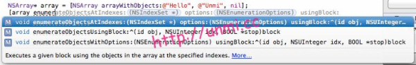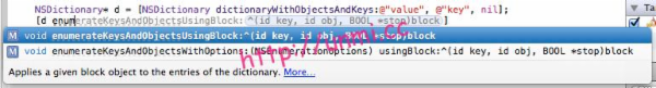 像 NSArray 的 enumerateObjectsUsingBlock 等三个方法,和 NSDictionary 的 enumerateKeysAndObjectsUsingBlock 等两个方法。别说三两个都用等等等,看图吧: